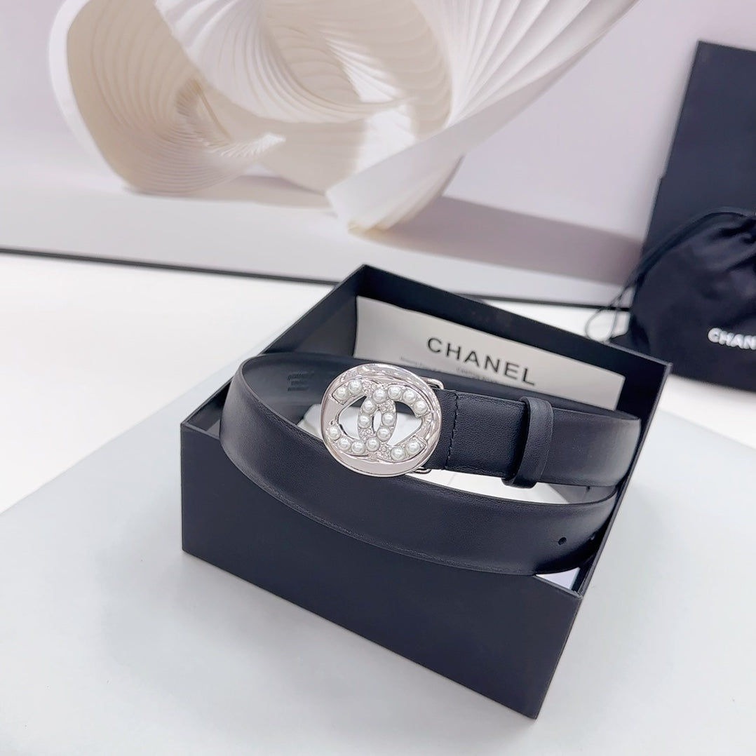 Cc 30Mm Belt In Black Calfskin Silver Hardware Attach Pearls