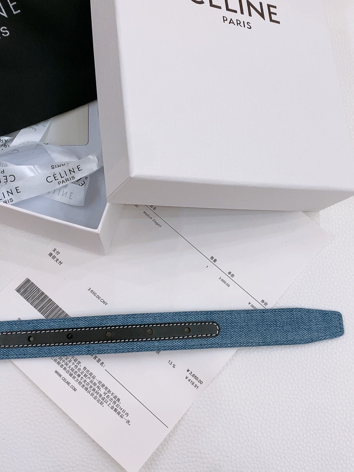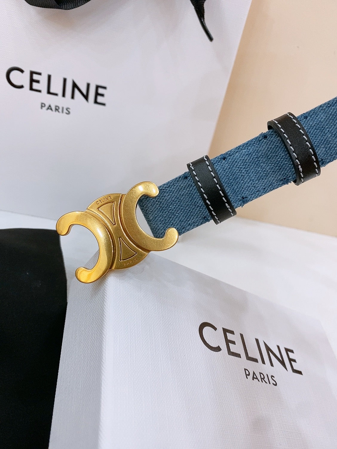 Celine 25S Belt Triomphe Taurillon 25Mm In Black Calfskin And Denim 558349