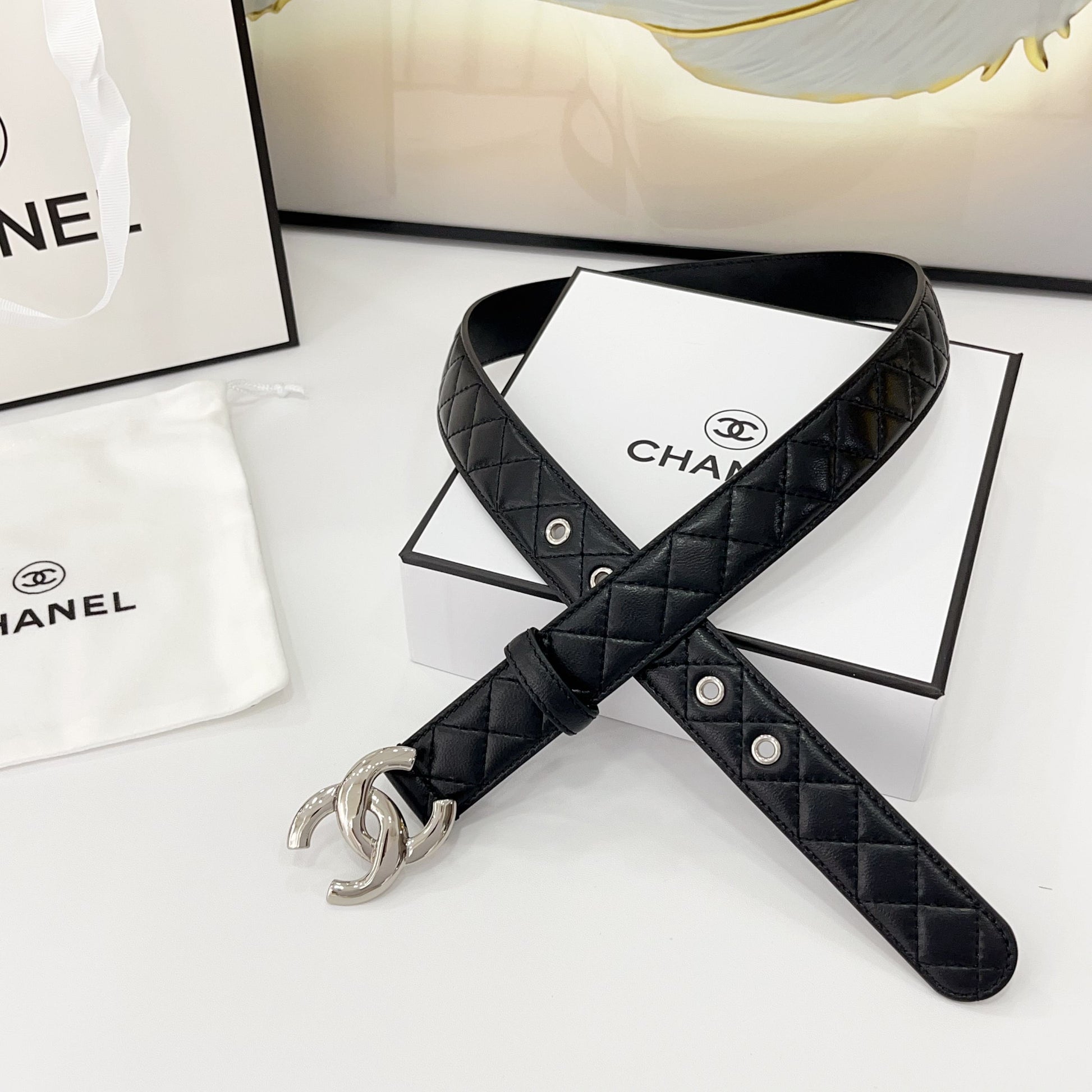 Double C Belt 30Mm In Black Quilted Leather With Silver Buckle