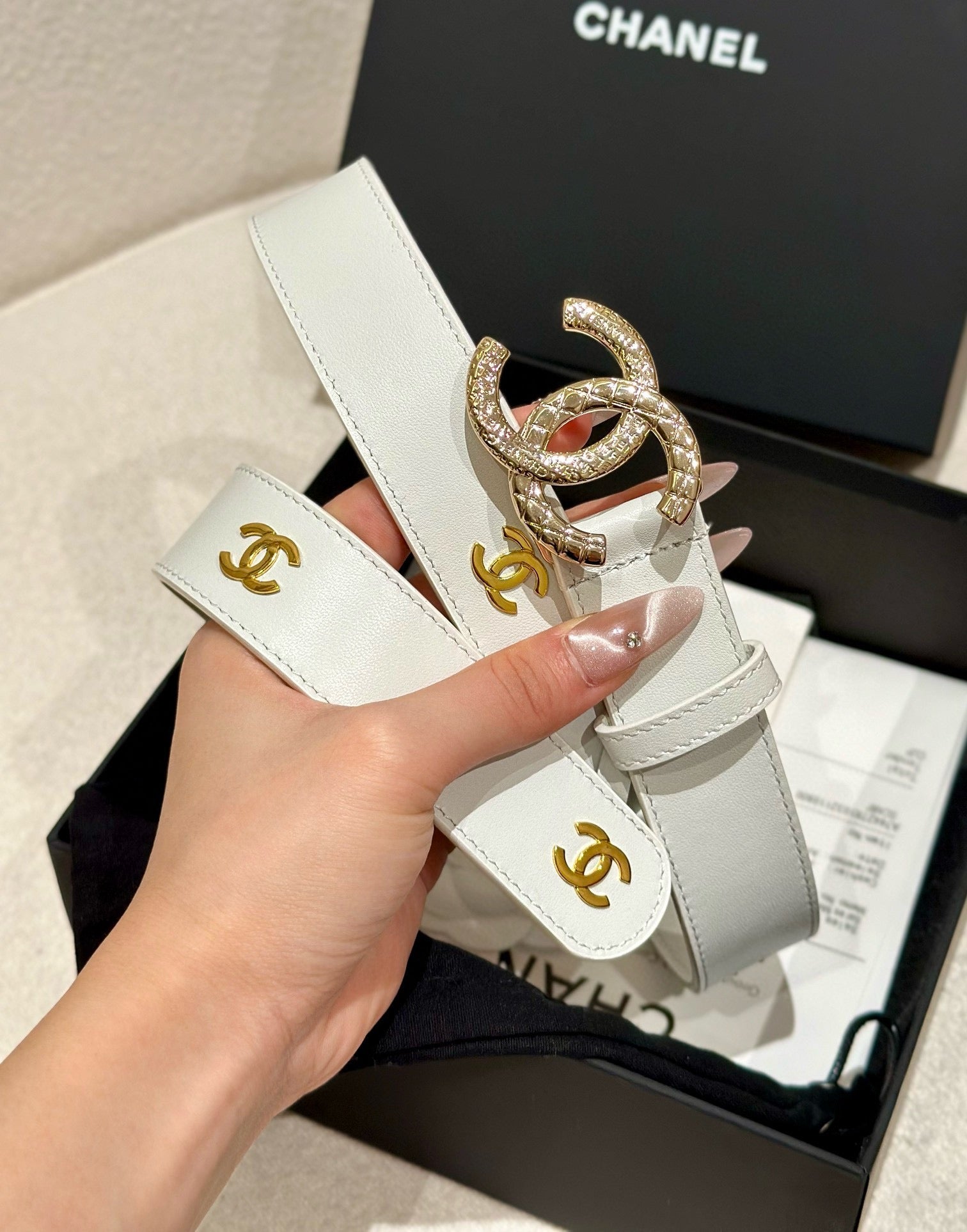 Double C Belt 30Mm In White Calfskin Gold Buckle With Embossed Check Pattern