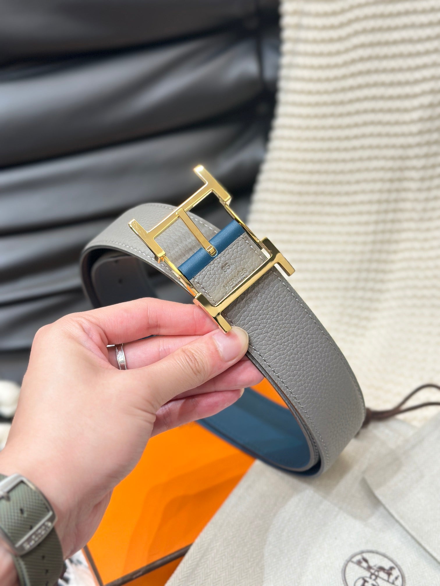 Hm Hadrien 38Mm Reversible Belt Grey And Blue Leather Gold Buckle