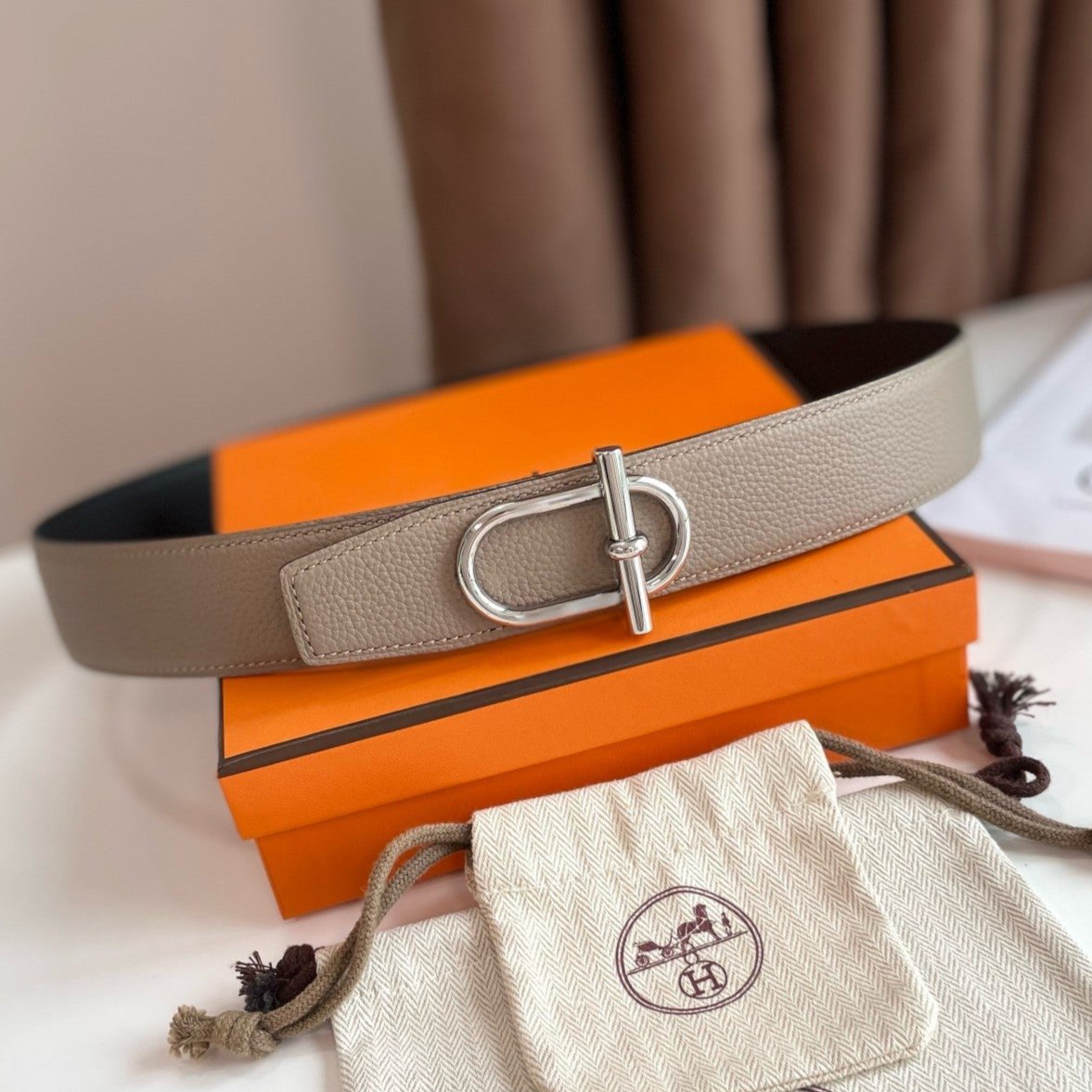 Hm Ithaque Belt Silver Buckle & Reversible Camel Brown And Black Leather Strap 38Mm