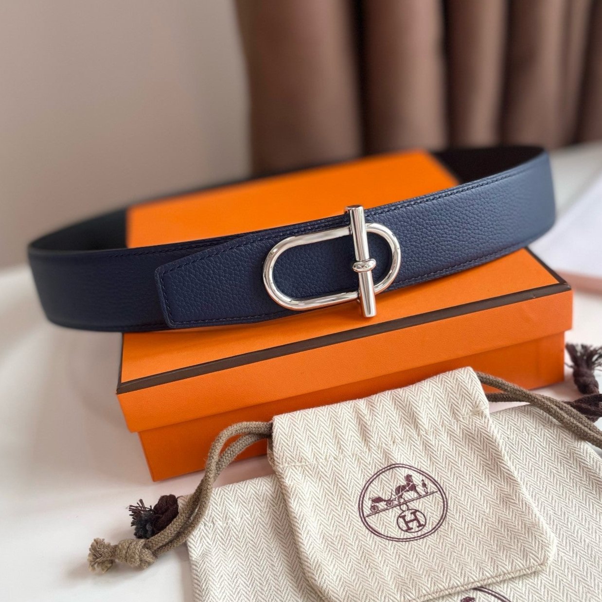 Hm Ithaque Belt Silver Buckle & Reversible Navy Blue And Black Leather Strap 38Mm