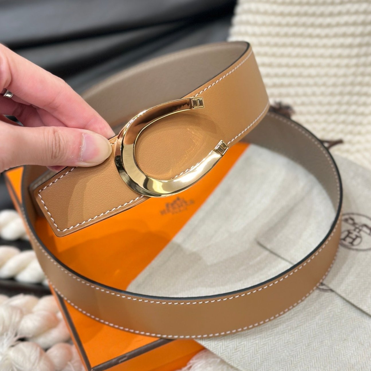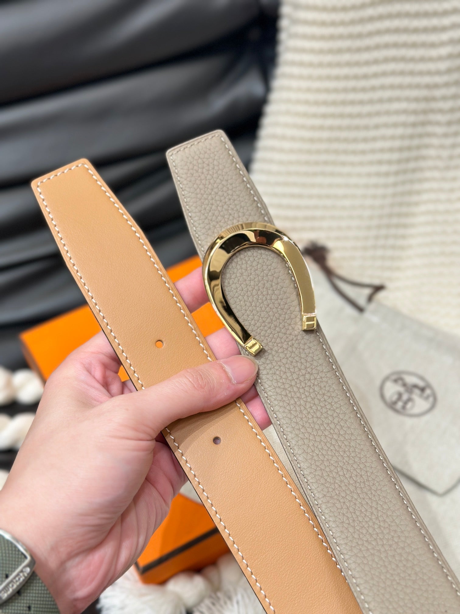 Hm Luck Belt Gold Buckle & Reversible Peanut Brown Leather Strap 38Mm