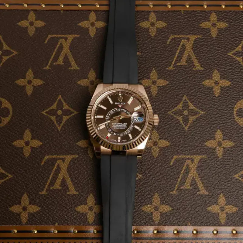 THE OYSTER PERPETUAL SKY-DWELLER IN 18 CT EVEROSE GOLD WITH A CHOCOLATE DIAL AND AN OYSTERFLEX BRACELET.