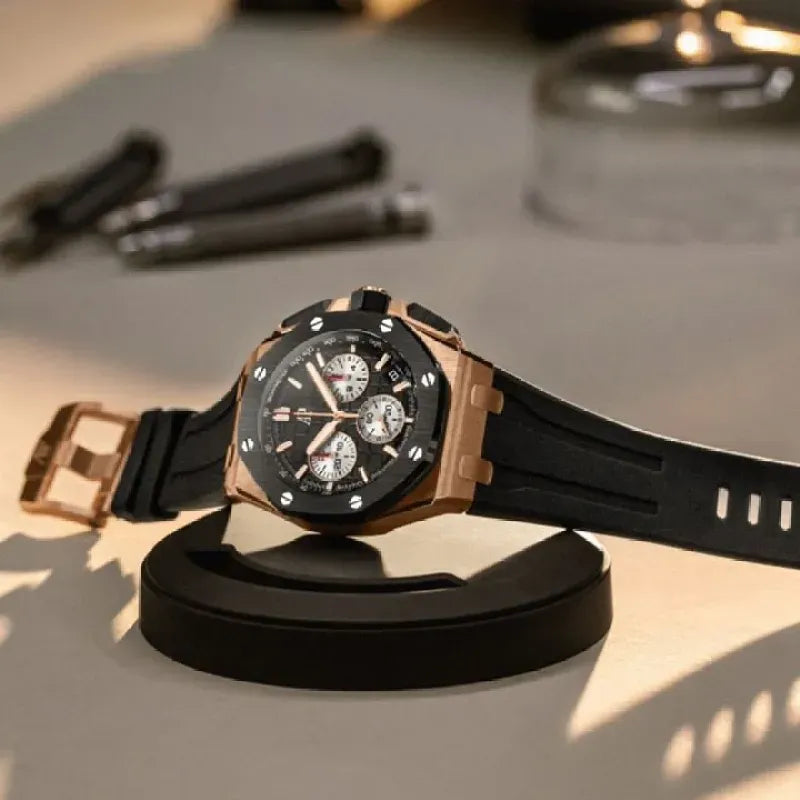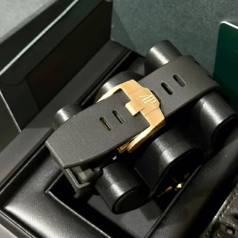 Interchangeable black rubber strap with 18K rose gold AP pin buckle.