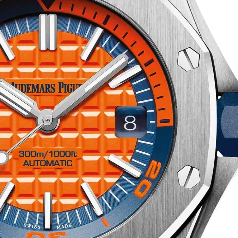 Orange dial with “Méga Tapisserie” pattern, white gold applied hour-markers and Royal Oak hands with luminescent coating, blue rotating inner bezel with diving scale and zone from 60 to 15 minutes in orange