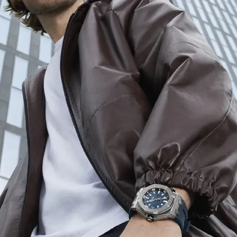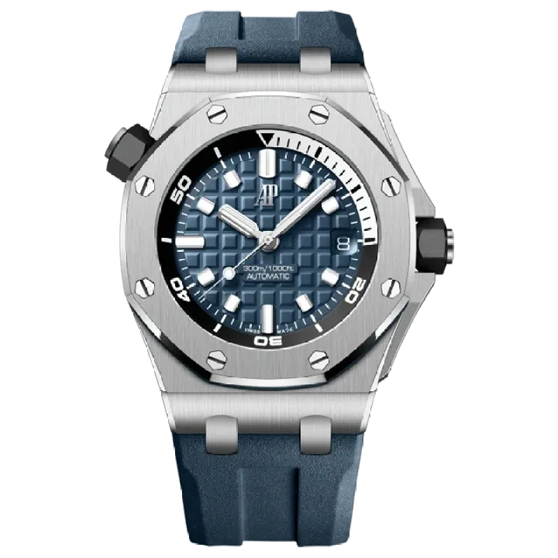 Blue dial with “Méga Tapisserie” pattern, white gold applied hour-markers and Royal Oak hands with luminescent coating, black rotating inner bezel with zone from 60 to 15 minutes in white