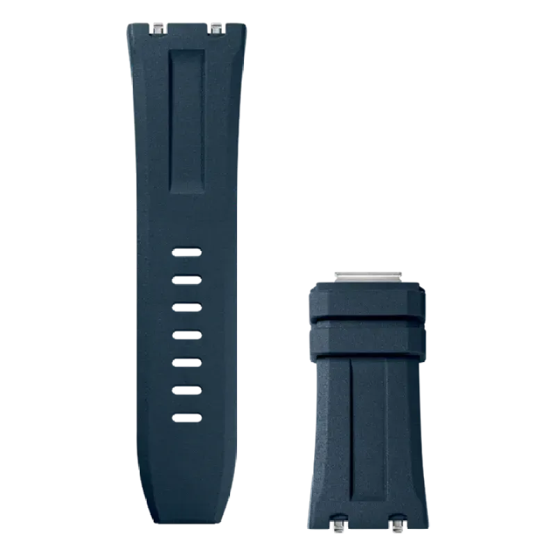 Blue rubber strap with stainless steel pin buckle and interchangeable strap system. Additional black rubber strap