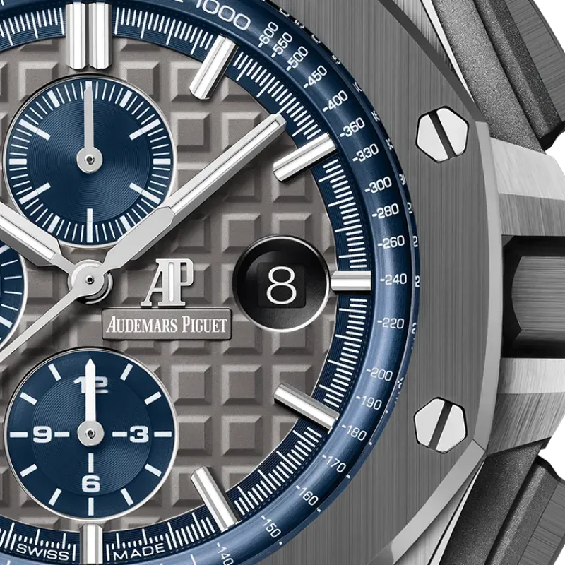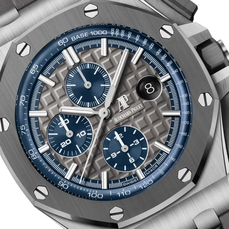 Grey dial with “Mega Tapisserie” pattern, blue counters and blue external zone, white gold applied hour-markers and Royal Oak hands with luminescent coating, blue inner bezel.