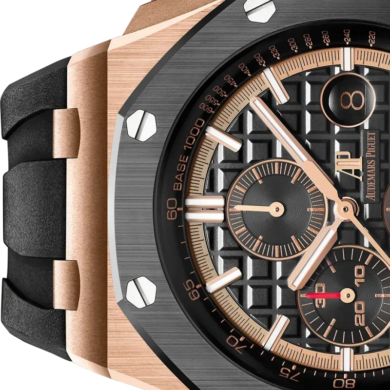 Black dial with “Méga Tapisserie” pattern, black counters, pink gold applied hour-markers and Royal Oak hands with luminescent coating, black inner bezel.