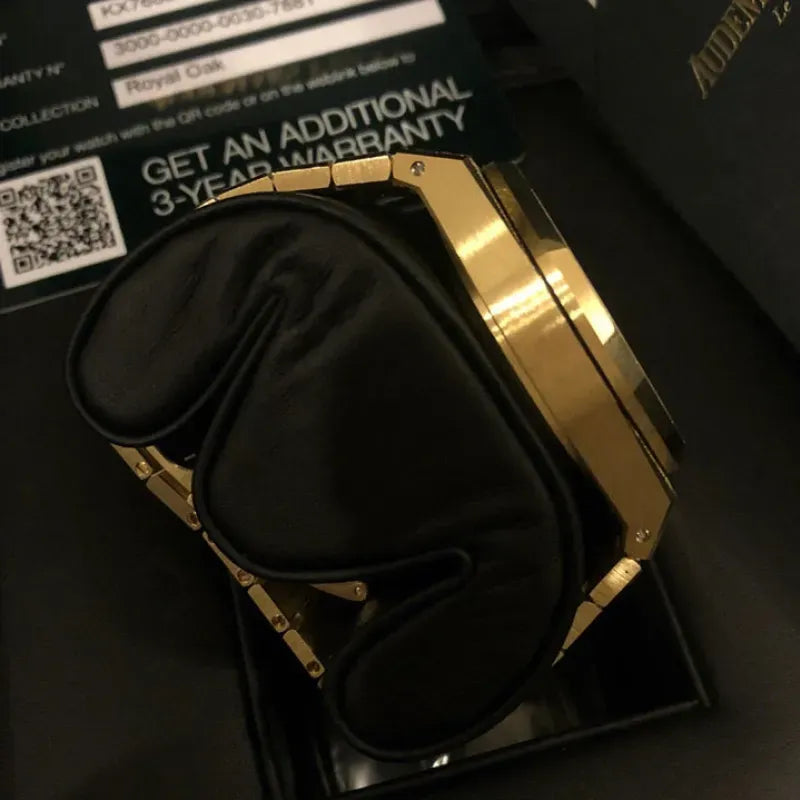 Yellow gold-toned dial with “Grande Tapisserie” pattern, black counters, yellow gold applied hour-markers and Royal Oak hands with luminescent coating.