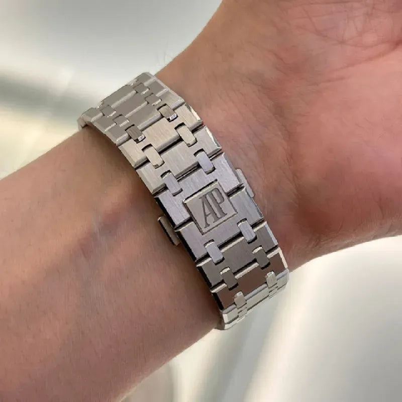 Black dial with “Grande Tapisserie” pattern, black counters, white gold applied hour-markers and Royal Oak hands with luminescent coating.