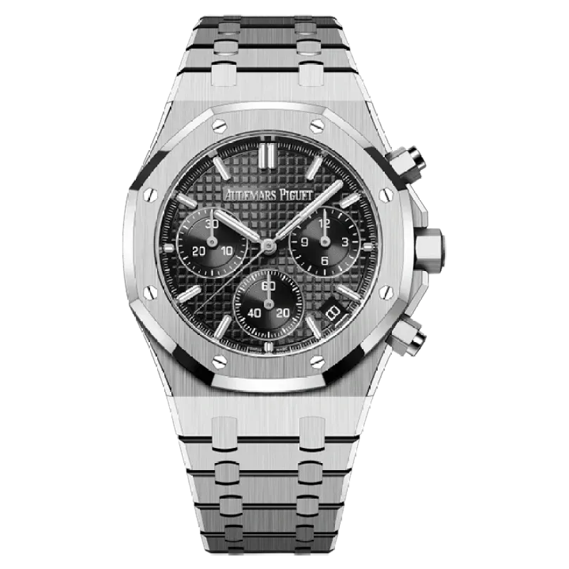 This 41 mm Selfwinding Chronograph encompasses the latest Royal Oak design evolution. Its stainless steel case and bracelet are embellished with a black “Grande Tapisserie” dial.