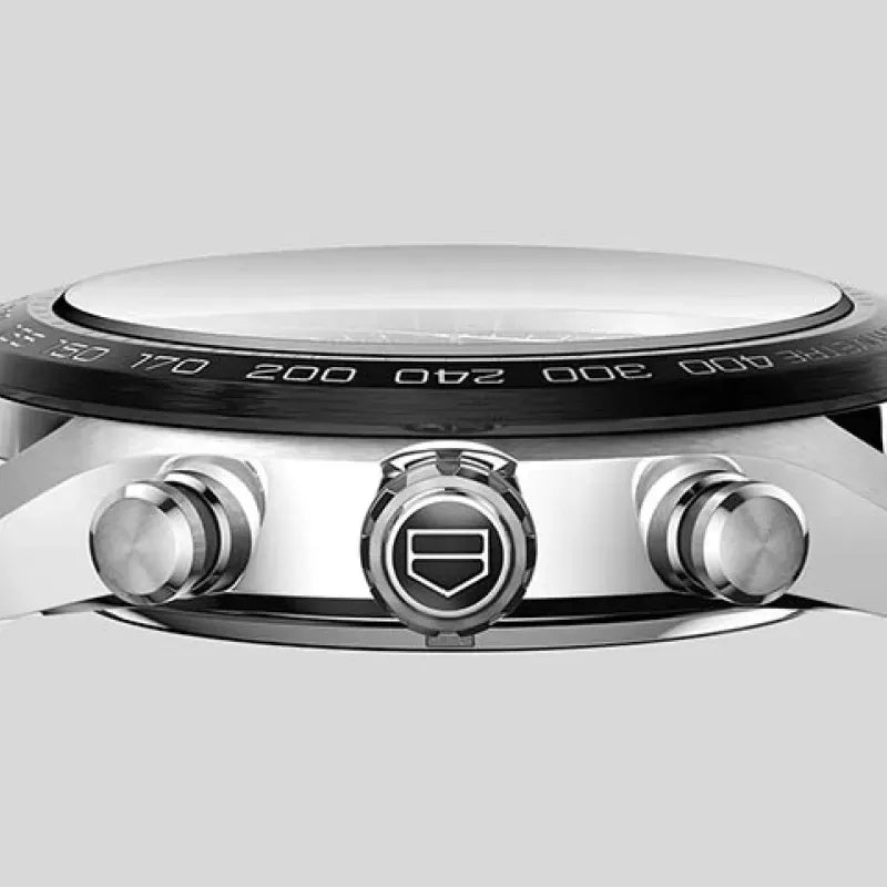 Tough ceramic black tachymeter fixed bezel and doubly anti-reflective sapphire crystal dome for telling time – and keeping it, too.