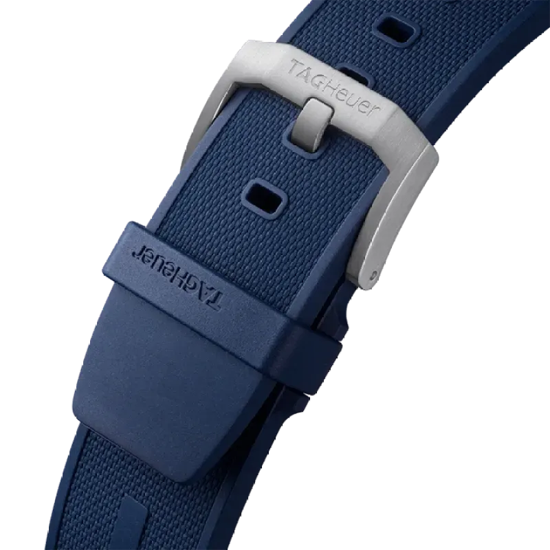 Fitted with a textured blue rubber strap, with TAG Heuer engraved pin buckle, this energetic challenger looks the part.