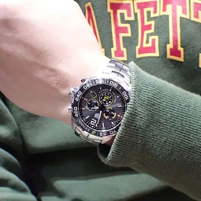 The 43mm case is steel, with screw-down crown at 3 o'clock and screw-down case back with special Senna engraving. Water resistant to 200 meters, it can take on all challenges.