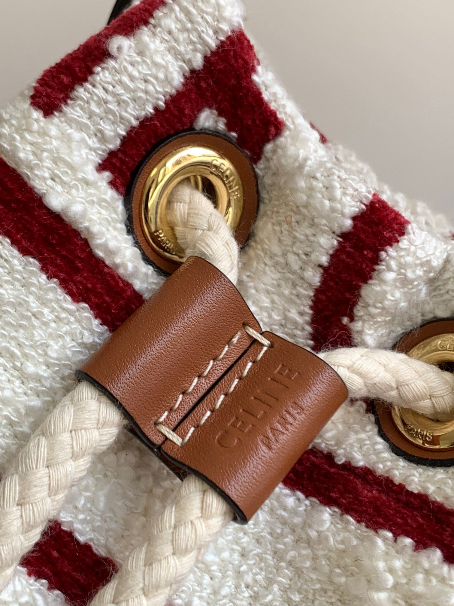 Material: fabric lining, hand carry, drawstring closure, leather handle length 13 cm
